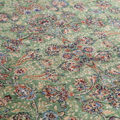 この絨毯は、ペルシャの伝統的な花のモチーフである「シャー・アッバシー」がたくさん描かれています。総柄のデザインが特徴で、優しい緑色の背景によってお部屋にも合わせやすく、自然な雰囲気を演出します。絨毯全体がシャー・アッバシーの美しい花々で満たされており、その繊細で華やかなデザインが空間に上品さと魅力をもたらします。