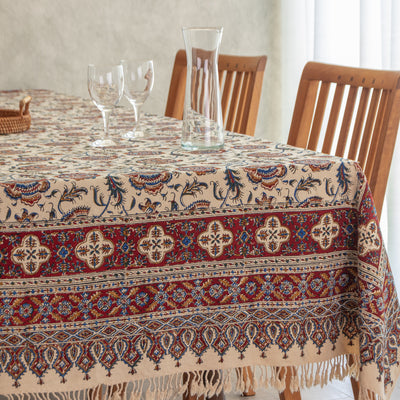 イランの古都イスファハン産の綿100%の木綿の布に、模様を彫り込んだ木製のはんこに天然染料をつけてスタンプを捺すように一つ一つ絵付けしています。シワになりにくく、適度に厚みもあるので、テーブルクロスだけでなく、ベッドやソファー・こたつ等のマルチカバーやタペストリーなど、アイデア次第で魅力的なインテリアになります。ご自宅で水洗いも可能です。